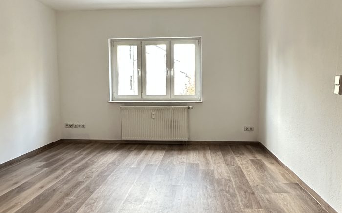 Das helle Wohnzimmer zur Straßenseite bildet das Herzstück der Wohnung. Dank seines gut proportionierten Zuschnitts lässt es eine moderne und individuelle Einrichtung problemlos zu, was ideal für ein stilvolles Wohnambiente ist.